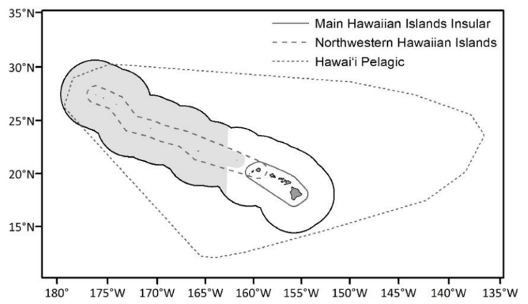 False killer whales (Pseudorca crassidens) are large toothed whales that inhabit sub-tropical and tropical oceanic domains worldwide and are considered rare throughout their range. Three distinct populations of false killer whales are found within the waters of the U.S. Exclusive Economic Zone (EEZ) around the Hawaiian Islands: two insular populations, one around the main Hawaiian Islands and the other around the Northwestern Hawaiian Islands, and the wide-ranging Hawaiʻi pelagic population.
